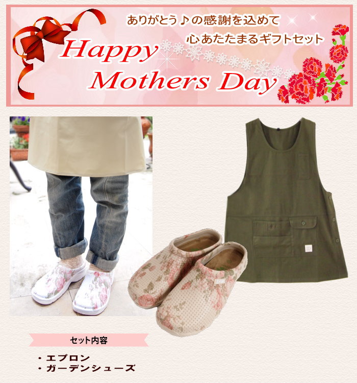 ガーデニングを楽しくおしゃれに Aタイプエプロン詳細は こちら Bタイプエプロン詳細は こちら シューズ詳細は こちら ・Spec 商品名 エプロンとガーデンサンダル2点ギフトセット 素材 ●エプロン ポリエステル65% 綿35% ●サンダル EVA素材 サイズ ●Aエプロン M〜L(フリーサイズ) バスト:79〜94cm 身長:154〜162cm 着丈:約78cm 身幅:約53cm ●Bエプロン M〜L(フリーサイズ) バスト:79〜94cm 身長:154〜162cm 着丈:約83cm 身幅:約53cm ●サンダル 37:23.5cm(甲幅約9.5cm×長さ約25cm) 38:24.0cm(甲幅約10cm×長さ約26cm) 重さ:約100〜130g(片足)